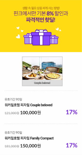 ◇ 핀크, 그랜드워커힐 서울 피자힐 핫딜 이벤트=핀크가 그랜드 워커힐 서울에 위치한 레스토랑 피자힐 특가 모바일 상품권 핫딜 이벤트를 진행한다. 이번에 판매하는 피자힐 모바일 상품권은 2종. 가족을 위한 패밀리 콤팩트는 15만 원, 커플을 위한 커플 빌러브드는 10만 원으로 17% 할인가에 구입할 수 있다. 커플 상품권은 커플 샐러드와 피자, 파스타와 소프트드링크 2잔으로 이뤄져 있다. 가족 상품권은 패밀리 샐러드와 피자, 파스타, 디저트, 소프트드링크 4잔. 모바일 상품권은 주중에만 이용할 수 있다.