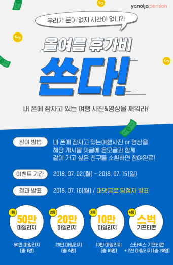 ◇ 야놀자펜션, 여름 휴가비 지원 이벤트=야놀자펜션이 휴가비 지원 및 영화 예매권 증정 이벤트를 실시한다. 여름 휴가비 지원 이벤트는 7월 15일까지 야놀자펜션 공식 페이스북 계정을 통해 진행한다. 보관 중인 여행 사진이나 영상 링크를 댓글로 달고 함께 여행가고 싶은 사람을 태그하면 응모할 수 있다. 당첨자에게는 1등 50만, 2등 30만, 3등 10만 마일리지를 증정하고 4등은 기프티콘을 준다. 또 7월 18∼31일까지는 애니메이션 영화 몬스터호텔3 티켓 증정 이벤트를 연다. 기획전을 통해 숙박 예약을 하는 고객 중 150명을 추첨해 1인당 2매씩 증정하는 것. 자세한 내용은 야놀자펜션 홈페이지를 통해 확인할 수 있다.