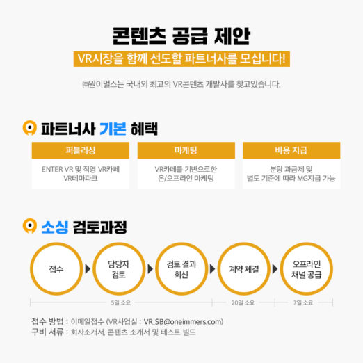 ◇ 원이멀스, VR콘텐츠 공급 파트너 모집=원이멀스가 VR콘텐츠 공급 파트너사를 모집한다고 밝혔다. 원이멀스는 VR 전문 콘텐츠 공급사로 VR 관련 온오프라인 콘텐츠 개발과 투자를 진행 중이며 글로벌 VR게임 개발사 서비오스와 전략적 제휴를 맺어 프리미엄 VR카페인 엔터VR 프랜차이즈 사업을 준비 중이다. 이번 모집은 프리미엄 VR카페에 맞는 콘텐츠 다양화와 VR 산업 생태계 활성화를 위해 기획한 것. VR콘텐츠를 보유한 사업체라면 누구나 참여 가능하다. 회사소개서와 콘텐츠 소개서, 테스트 빌드 등을 이메일(VR_SB@oneimmers.com)로 보내면 된다. 파트너로 선정되면 엔터VR을 비롯한 전국 10여 개 직영 VR오프라인 카페, 앞으로 전개할 프랜차이즈 지점과 올 하반기 부산에 문을 열 VR테마파크에 콘텐츠를 공급하게 된다. 수익 배분도 분당 사용료를 지급하며 영향력 등 별도 기준에 따른 최소보장금액도 제공받을 수 있다.