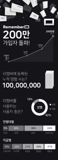 드라마앤컴퍼니는 자사의 명함 관리앱 리멤버의 누적 가입자 수가 200만 명을 넘어섰다고 밝혔다. 또 누적 처리 명함 수는 1억 장을 넘었다.
