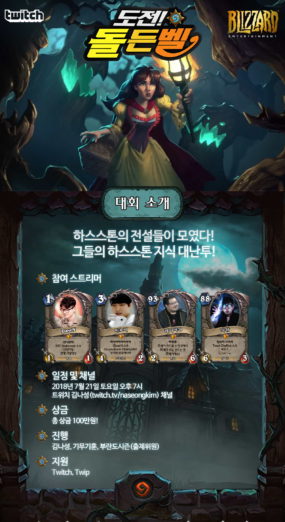 ◇ 트위치, 하스스톤 퀴즈쇼 도전! 골든벨 개최=트위치코리아가 7월 21일 19시 트위치 김나성(/naseongkim) 채널을 통해 하스스톤을 주제로 진행하는 퀴즈쇼 ‘도전! 돌든벨’을 개최한다고 밝혔다. 이번 행사에는 C9 소속 프로게이머 따효니, 종합 게임 스트리머 룩삼, 레니아워, 던 등 4명이 나와 대결을 펼친다. 지난 4월 출시된 마녀숲 확장팩에 대한 문제가 주로 출제되며 총 상금은 100만 원이다. 문제별 상금을 획득하는 방식이어서 결과는 예측할 수 없다. 이번 행사에선 시청자를 위한 퀴즈 이벤트도 진행된다. 방송 중 문제마다 정답자 2명을 추첨해 10명에게 문화상품권을 증정한다.
