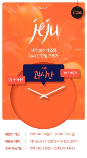 데일리호텔, 제주 성수기 인기 호텔 원데이 초특가 프로모션 앙코르=데일리호텔이 7월 23∼27일까지 자사 앱을 통해 인기 제주 호텔 10곳을 최소 3만 9,900원부터 만날 수 있는 제주 성수기 인기 호텔 원데이 초특가 프로모션을 앙코르 진행한다고 밝혔다. 이번 행사는 제주 인기 호텔을 24시간마다 최대 85% 할인가에 한정 오픈하는 이벤트. 행사는 매일 오전 10시 데일리호텔 앱을 통해 만나볼 수 있으며 매일 다른 호텔 상품이 올라온다. 해당일 오픈된 호텔은 24시간 한정 예약 상품이다. 체크인 날짜는 7월 23일부터 9월 19일까지 지정할 수 있다.