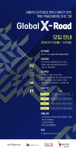 서울XR스타트업, Global X-Road 참가사 모집=서울XR스타트업이 8월 5일까지 ‘Global X-Road’ 참가사를 모집한다. 글로벌 엑스로드는 한국콘텐츠진흥원으로부터 글로벌 특화 액셀러레이터로 선정된 SXS가 운영하는 액셀러레이팅 프로그램. AR이나 VR, XR, 블록체인 관련 콘텐츠를 개발 중인 기업이나 개인 사업자 10개팀을 선발해 6개월간 프로그램을 진행한다. 선발팀에게는 초기 지원금 지급, 일본 ‘Tokyo XR Startups’과 함께 하는 해외 프로그램 참가, 맞춤형 멘토링, 네트워킹과 IR 피칭 교육 등을 제공한다. 우수 개발사로 선정되면 기업별 최대 1억 원 상당 투자로 진행할 예정. 한편 벤처스퀘어도 보조 사업자로 선정, SXS와 함께 이번 프로그램을 공동 운영하고 참가사를 위한 홍보 마케팅과 IR코칭 등을 지원한다. 참가하려면 이곳에서 신청하면 된다.