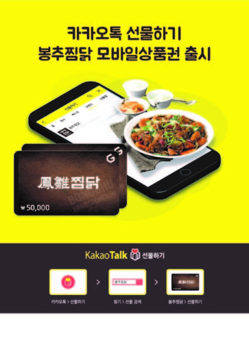◇ 스마트콘, 봉추찜닭 모바일상품권 출시=스마트콘이 봉추찜닭 모바일상품권을 출시했다. 봉추찜닭 모바일상품권은 카카오톡 선물하기를 통해서도 구입할 수 있다. 김종현 스마트콘 대표는 “모바일상품권은 그저 고객의 간편한 선물의 개념을 넘어 고객서비스와 마케팅 수단으로 발전하고 있는 만큼 봉추찜닭의 성장에 보탬이 되기 위해 최선의 노력을 기울이겠다”고 밝혔다.