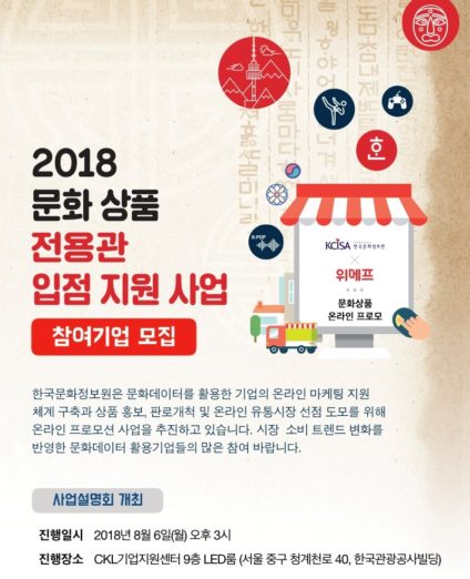 ◇ [8월 6일 월] 2018 문화상품 전용관 입점 지원사업 사업설명회=스타트업 교육·컨설팅 전문 기업 더피치가 한국문화정보원과 위메프가 진행하는 ‘2018 문화상품 전용관 입점 지원사업’ 참가 기업을 모집한다. 사업설명회는 오는 8월 6일 월요일 오후 3시부터 CKL기업지원센터 9층 LED룸에서 열릴 예정.