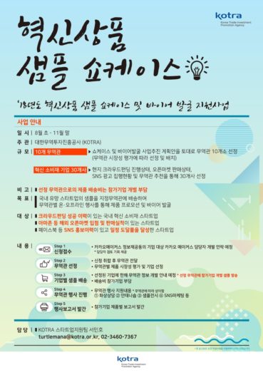 ◇ [8월 6일 월] 2018 혁신상품 샘플 쇼케이스 및 바이어 발굴 지원사업=대한무역투자진흥공사(KOTRA)가 국내 혁신 스타트업의 해외바이어 발굴을 위해 10개 무역관과 협력해 혁신 소비재 기업 30개사를 선정, 혁신상품 샘플 쇼케이스 사업을 진행한다. 지원사업은 7월 29일까지 신청 받으며 사업은 8월 6일부터 11월 30일까지 10개 무역소가 국내 유망 스타트업 샘플을 지정무역관에 배송해 무역관별 온온프라인 행사를 통해 제품 프로모션과 바이어 발굴을 진행한다. 신청조건은 크라우드펀딩 성공 이력이 있는 국내 혁신 소비재 스타트업, 아마존 등 해외 오픈마켓 입점 및 판매실적이 있는 스타트업, 페이스북 등 SNS 홍보이력이 있고 일정 도달률을 달성한 곳을 대상으로 한다. 행사에 대한 자세한 내용은 이곳에서 확인할 수 있다.