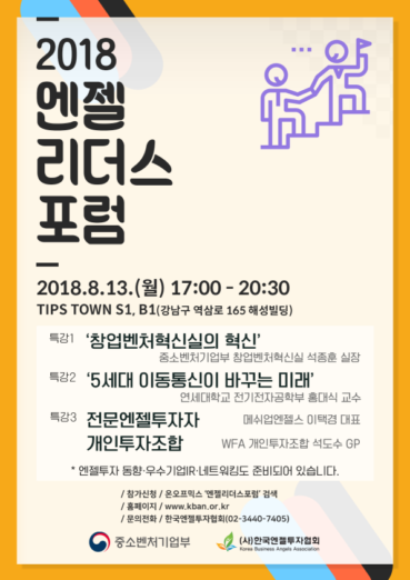 ◇ [8월 13일 월] 제7회 엔젤리더스포럼=엔젤투자자, 개인투자조합, 엔젤투자에 관심 있는 사람들을 위한 제7회 엔젤리더스포럼이 오는 8월 13일 17시부터 서울 역삼동 팁스타운S1에서 개최된다. 행사는 한국엔젤투자협회 이인수 팀장이 엔젤투자동향으로 시작해 중소벤처기업부 창업벤처혁신실 석종훈 실장이 창업벤처혁신실의 혁신을, 연세대학교 전기전자공학부 홍대식 교수가 5세대 이동통신이 바꾸는 미래를 전문엔젤투자자와 개인투자조합이 투자자 주체별 투자 사례 및 경험 공유를 하는 시간을 갖고 유망 스타트업 6곳의 IR 시간이 열린다. 행사에 자세한 내용은 이곳에서 확인할 수 있다.