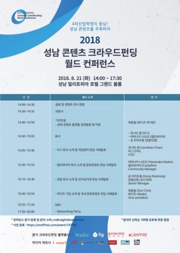 글로벌 크라우드펀딩 플랫폼 사례 발표도 진행될 예정이다. 게임 특화 크라우드펀딩 채널 ‘fig’는 기업 소개 및 게임 분야 펀딩 사례발표, 일본 크라우드펀딩 플랫폼 캠프파이어는 기업 소개 및 문화콘텐츠 펀딩 사례발표를 진행한다. 중국 크라우드펀딩 플랫폼 ‘JD’도 발표에 참여하며 국내 크라우드펀딩 플랫폼 와디즈는 기업 소개 및 국내 문화콘텐츠 펀딩 사례를 발표할 예정이다.