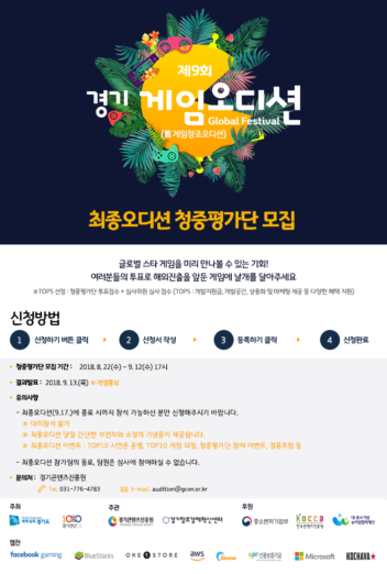 경기도가 국내 게임기업의 세계시장 진출을 위한 제9회 경기게임오디션-글로벌 부문(이하 ‘오디션’) 최종 우승팀 선발에 참여할 청중평가단을 22일부터 9월 12일까지 모집한다.