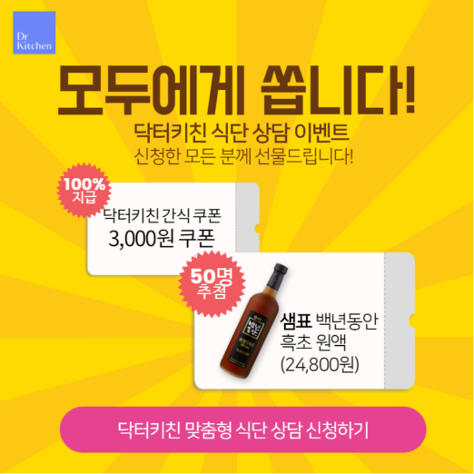 이벤트는 닥터키친 공식 페이스북 페이지와 인스타그램을 통해 8월 31일까지 참여 할 수 있다. 참여자 전원에게 닥터키친 간식 쿠폰이 지급되고 추첨을 통해 샘표 흑초 원액이 증정될 예정이다.
