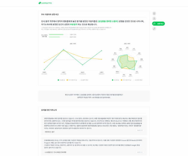 이번 서비스는 자기소개서에 쓰인 100만 개 이상 언어 표현과 역량 간 관계를 분석해 지원자의 성향과 강점을 분석해준다. 구직자가 자기소개서를 입력하면 이를 객관적으로 평가해 강점과 성향이 지원 직무 요구 사항에 맞는지 여부를 확인해볼 수 있다는 설명이다. 그 뿐 아니라 우수 지원자가 보유한 역량이나 성향을 자신의 자기소개서 분석 결과와 비교해 수정 방향이나 면접 준비에 대한 가이드라인도 제시해준다.