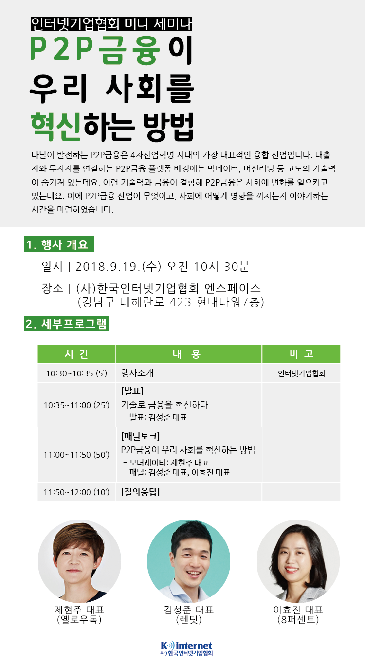 이번 세미나는 P2P 금융 산업을 기술 기반 스타트업 관점에서 조명하기 위해 마련한 것. 행사에는 김성준 렌딧 대표가 ‘기술로 금융을 혁신하다’를 주제로 강연에 나서고 제현주 옐로우독 대표를 좌장으로 초청해 이효진 8퍼센트 대표, 김성준 렌딧 대표가 P2P금융이 우리 사회를 혁신하는 방법을 주제로 토론을 진행한다.
