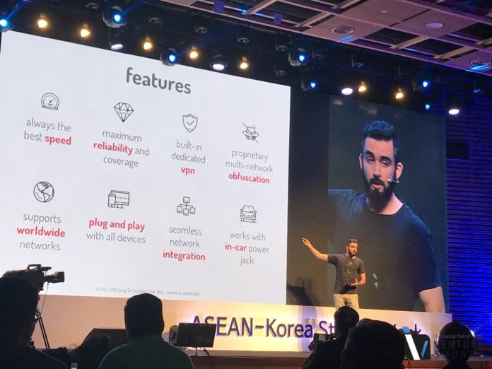 ◇스웨그 테크놀로지(Swag Technology Sdn Bhd)=다수의 유무선 네트워크를 통합하는 와이파이 라우터를 선보이고 있다. 각각의 네트워크 속도는 낮지만 합치면 속도를 끌어올릴 수 있다는 아이디어에서 착안했다. 현재 모바일 사업자를 타겟으로 한 스웨그1, 3개의 슬러시를 갖춘 스웨그3, 스마트폰 사용자를 위한 스웨그 모드 총 3개의 라인업을 갖추고 있다. 한국에서 스웨그 시리즈를 출시할 파트너를 찾고 있다.