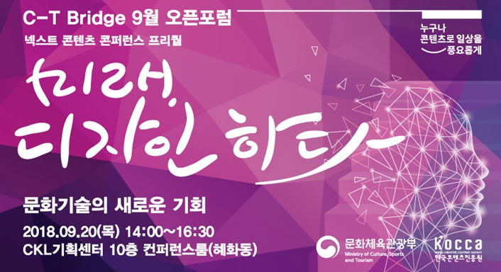 C-T Bridge 9월 오픈포럼이 9월 20일 서울 혜화동 CKL기획센터에서 열린다. 문화체육관광부가 주최하고 한국콘텐츠진흥원이 주관하는 이번 행사는 ‘미래, 디자인하다’를 주제로 산업 생태계와 환경이 문화 기술에 미치는 영향을 알아본다.