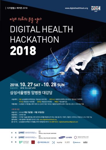 성균관대학교 삼성융합의과학원 디지털헬스학과와 디지털헬스케어파트너스(DHP)가 10월 27∼28 양일간 삼성서울병원 암병원 대강당에서 제3회 디지털헬스 해커톤 2018을 개최한다.