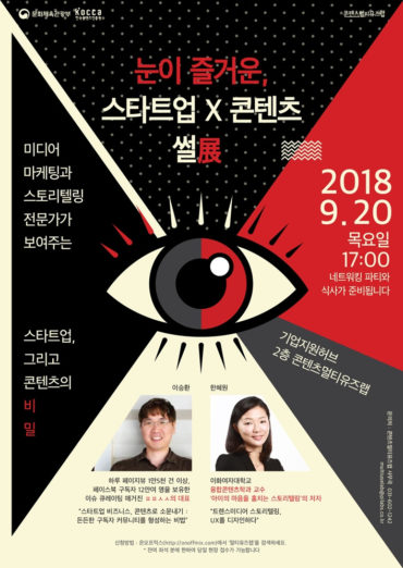 이번 행사에선 ㅍㅍㅅㅅ 이승환 대표, 이화여자대학교 융합콘텐츠학과장 한혜원 교수가 연사로 나선다. 이승환 대표는 스타트업 비즈니스, 콘텐츠로 소문내기를 주제로 구독자 커뮤니티 형성 비법에 대해 강연을 한다. 한혜원 교수는 트렌스미디어 스토리텔링 강연을 진행, 스타트업 사용자 경험 디자인 방법에 대해서 조언할 예정이다.