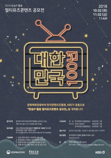 문화체육관광부와 한국콘텐츠진흥원이 한국방송공사와 함께 2018 방송IP 활용 멀티유즈콘텐츠 공모전을 개최한다. 11월 2일까지 접수 마감하는 이번 공모전은 방송 원천 콘텐츠 활용을 통해 새로운 아이디어를 발굴하고 우수 창작자를 육성하기 위해 마련한 것이다.