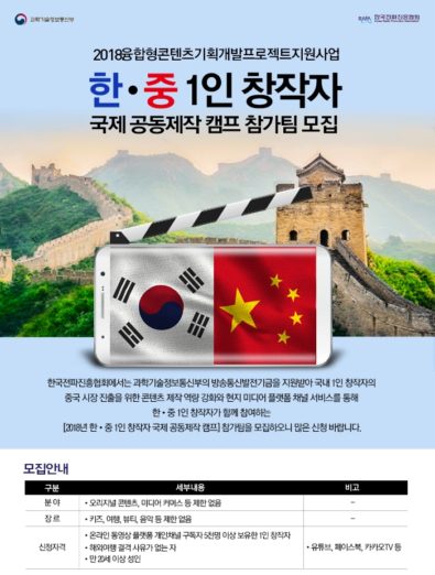 한국전파진흥협회가 10월 31일까지 중국 시장 진출을 위한 한·중 1인 창작자 국제공동제작캠프 참가팀을 모집한다.