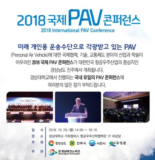 ◇ [10월 29일 월] 2018 국제 PAV 컨퍼런스=경남테크노파크의 PAV(Personal Air Vehicle)컨퍼런스가 10월 29일 경상남도 진주 경상대학교에서 개최된다. 이번 행사는 미래 개인용 운송수단으로 각광받고 있는 PAV에 대한 국제협력, 기술, 교통제도 분야의 산업과 학술이 어우러진 자리다. 행사는 국제 PAV드론 기술 경연대회 시상을 시작으로 항공안전기술원 김연명 원장이 PAV 산업 현황 및 전망. PAL_V 개발현황, UTM연구와 PAV교통관리, 미래교통체계 등을 이야기한다. 행사에 대한 자세한 내용은 이곳에서 확인할 수 있다.