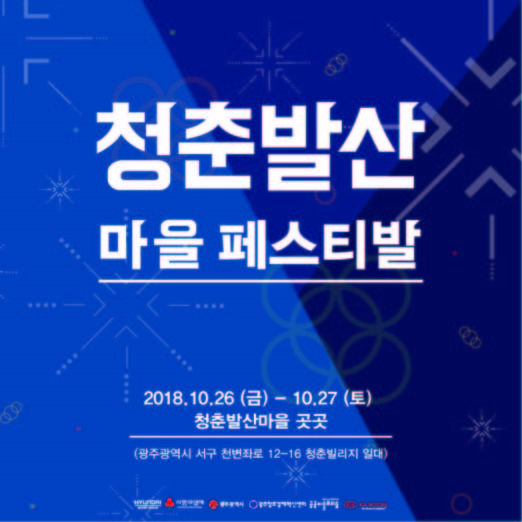 ◇ [10월 26일 금] 2018 청춘발산 페스티벌=지속가능한 지역재생 플랫폼 광주광역시 서구 ‘청춘발산마을’이 마을 페스티벌을 10월 26∼27일까지 개최한다. 청춘발산마을은 2015년도부터 2018년 현재까지 4년차 진행 중인 민관협력 도시재생사업으로, 사업 초기에는 공폐가를 리모델링해 거점공간을 조성하고 마을에서 찾은 색과 패턴으로 컬러아트프로젝트를 진행했다.