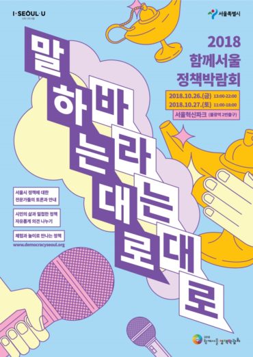 ◇ [10월 26일 금] 2018함께서울 정책박람회=서울시의 대표적인 시민정책참여축제 2018함께서울 정책박람회가 10월 26∼27일까지 양일간 개최된다. 이번 정책 박람회는 시민들이 자유롭게 정책을 상상하고 제안하는 장을 마련하고자 서울정책토크와 정책포럼, 시민공론장, 라이브방송 등 다채로운 프로그램을 마련했다.