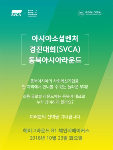 ◇ [10월 23일 화] SVCA 동북아라운드 데모데이=동북아시아 대표 사회혁신기업이 함께하는 제13회 아시아 소셜벤처 경진대회 SVCA(Social Venture Competition Asia) 동북아시아라운드가 10월 23일 서울 성수동 헤이그라운드에서 열린다.