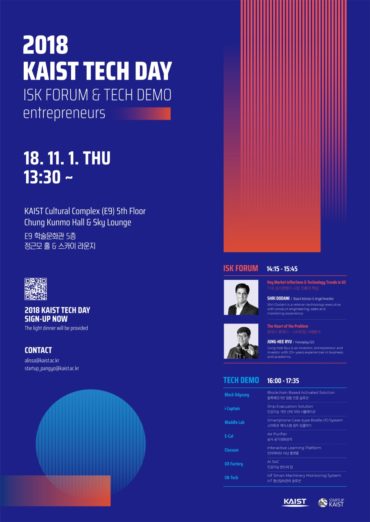 ◇ [11월 01일 목] 2018 KAIST TECH DAY=카이스트 창업원이 주관하는 2018 카이스트 테크데이가 11월 1일 13시 30분부터 대전 카이스트 학술문화관 5층 정근모홀&스카이라운지에서 열린다. 이번 행사는 올해로 2회를 맞은 미래 핵심 기술 기반 스타트업 축제로 ISK포럼과 테크 데모데이 세션으로 진행된다.