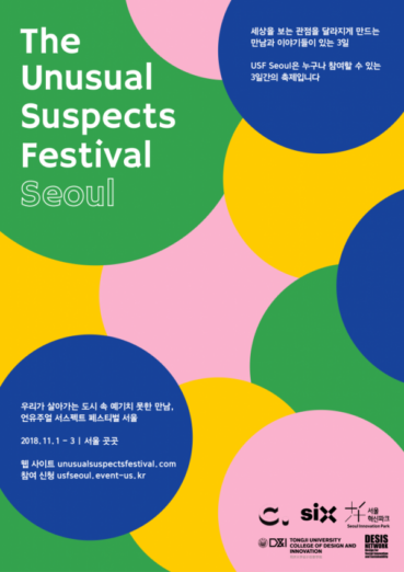 ◇ [11월 1~3일] 언유주얼 서스펙트 페스티벌 서울=글로벌 사회혁신 커뮤니티 식스가 2014년 처음 시작한 언유주얼 서스펙트 페스티벌이 런던과 글래스고, 북아일랜드 다시 런던을 거쳐 처음으로 영국 밖 서울에서 11월 1∼3일까지 서울의 다양한 공간에서 개최된다.