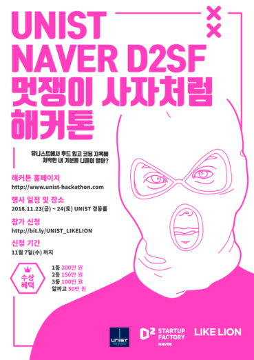 네이버 D2SF가 후원하고 멋쟁이 사자처럼이 주관하는 이번 행사는 울산과학기술원 학생이 아니어도 대학(원)생이면 누구나 참여할 수 있다. 재학생이나 휴학생 여부도 관계없다. 주제는 자유이며 웹이나 앱 등 분야에도 제약이 없다. 참가 비용은 무료이며 참여자 중 수상자에게는 1등 200만 원, 2등 150만 원, 3등 100만 원, 알까고 50만 원 등 상금 혜택을 부여한다. 행사에 참여하려면 11월 7일까지 홈페이지를 통해 신청하면 된다.