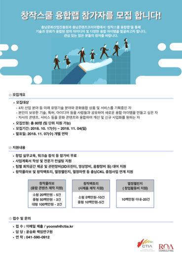 충남문화산업진흥원과 충남콘텐츠코리아랩이 11월 4일까지 창작스쿨 융합랩 참가자를 모집한다.
