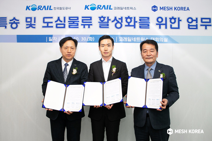 메쉬코리아가 코레일, 코레일네트웍스와 도심 물류 활성화를 위한 업무협약을 체결했다고 밝혔다.
