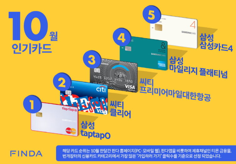 카드 순위는 10월 한 달간 핀다 홈페이지와 앱, 티몬 금융몰, 번개장터 등 제휴 채널에서 ‘가입하기’ 클릭 수를 가장 많이 받은 상품을 기준으로 선정했다.