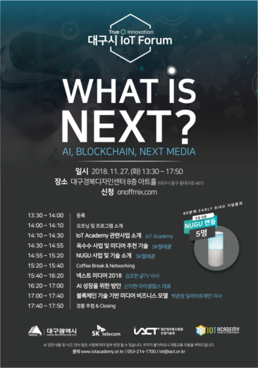 11월 진행 주제는 “What is NEXT? AI, Blockchain, Next Media”다. 인공지능과 블록체인, 넥스트 미디어 등 차세대 기술에 대해 다루는 것이다. 이 날 행사에선 SK텔레콤 옥수수와 누구(Nugu) 사업 기술 세션에 이어 김조한 곰TV 이사, 신지현 마이셀럽스 이사, 박춘원 딜라이트체인 이사가 강연에 나설 예정이다. 강연 이후에는 경품 추첨을 겸한 이벤트도 진행한다.