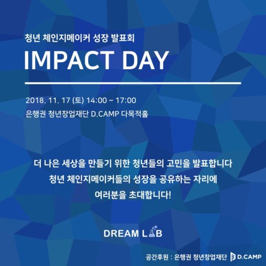 청년 체인지메이커 양성 교육을 진행하는 드림랩(DREAM LAB)이 17일 디캠프 선릉센터 6층 다목적홀에서 임팩트 데이(IMPACT DAY)를 개최한다.