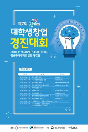 경북창조경제혁신센터가 11월 9일 금오공과대학교 본관 대강당에서 제7회 G-STAR대학생 창업경진대회를 개최한다고 밝혔다.