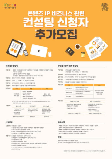 산업계 전문가 일반 컨설팅은 IP 비즈니스, 홍보마케팅, 유통배급 관련 콘텐츠 업계 전문가가 맞춤형 컨설팅을 제공한다. 온라인이나 1:1 대면 컨설팅 외에 자문 의견서를 지원한다. 신청은 12월 28일까지다.