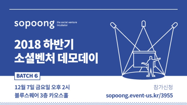 ◇ [12월 07일 금] sopoong 2018 하반기 소셜벤처 데모데이=소셜벤처 액셀러레이터 에스오피오오엔지(sopoong)가 12월 7일 금요일 용산구 블루스퀘어 3층 카오스홀에서 sopoong 2018 하반기 소셜벤처 데모데이를 개최한다. sopoong(에스오피오오엔지)는 2008년 설립해 쏘카, 텀블벅, 스페이스클라우드 등 42개 소셜벤처와 시작을 함께해 총 기업 가치 6,165억원을 만들어낸 전문적인 소셜벤처 액셀러레이터.
