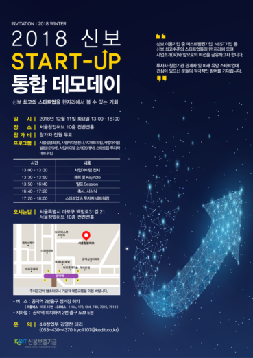 ◇ [12월 11일 화] 2018 신보 Start-up 통합 데모데이=신용보증기금이 2018 신보 Start-up 통합 데모데이를 12월 11일 13시부터 서울창업허브 10층 컨벤션홀에서 개최한다. 이번 통합 데모데이는 퍼스트펭귄기업, NEST기업 등 신용보증기금과 함께한 8개 스타트업, 지점에서 신보 최고 수준의 스타트업을 한 자리에 모아 사업소개(IR)와 앞으로의 비전을 공유하기 위한 자리다. 이번 행사에서는 사업설명회, 사업 아이템 전시, VC 네트워킹, 12개 기업의 사업 아이템 발표, 20개 기업의 사업 아이템 소개, 스타트업과 투자자의 네트워킹 시간을 가질 예정. 행사에 대한 자세한 내용은 이곳에서 확인할 수 있다.