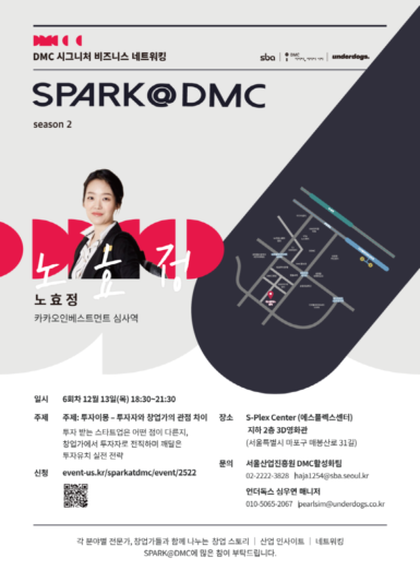 ◇ [12월 13일 목요일] SPARK@DMC 6회차 :투자이몽=서울산업진흥원이 DMC의 시그니처 행사인 ‘6회차: 투자이몽 – 투자자와 창업가의 관점 차이’ 강연을 13일 서울시 마포구 에스플렉스센터 지하2층 3D 영화관에서 개최한다. SPARK@DMC는 7∼12월까지 매월 1회 각계각층 전문가들의 창업 노하우와 관련 산업군 이야기들을 들을 수 있는 특강과 더불어 전문가와 VC에게 피드백을 받아 자신의 아이템을 검증하고 고도화 할 수 있는 IR피칭 세션 그리고 분야별 전문가 네트워킹 시간으로 이뤄진 DMC의 시그니처 비즈니스 네트워킹 행사다.