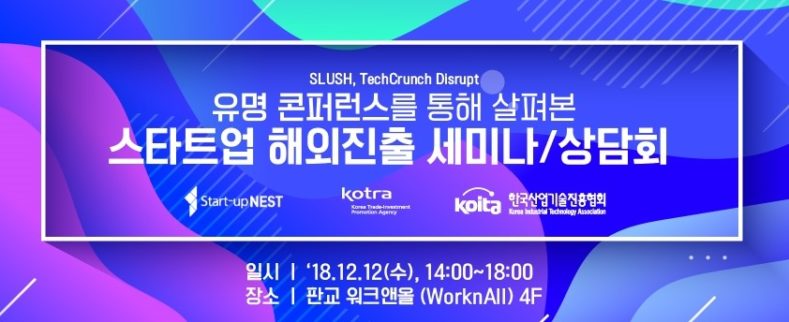 ◇ [12월 12일 수] [KOTRA] 스타트업 해외진출 세미나/1:1 상담회=대한무역투자진흥공사(KOTRA)가 오는 12일 수요일 오후 2시부터 판교 알파돔타워4, 4층 워크앤올에서 스타트업 해외진출 세미나와 1대1 상담회를 진행한다. 이번 행사는 스타트업의 해외진출을 위해 KOTRA와 신용보증기금, 한국산업기술진흥협회가 주최한다. 최신 트렌드 습득 및 맞춤형 해외진출 상담을 희망하는 스타트업 누구나 신청해 참여가능하다. 행사 프로그램은 스타트업 생태계 현황 분석부터 글로벌 스타트업 콘퍼런스를 통해 살펴본 유럽 스타트업 최신 트렌드, 해외진출 유망지역 발굴전략 등 강연과 행사 주최 기관별 스타트업 지원사업 안내, 1대1 맞춤형 컨설팅도 함께 진행할 예정이다. 행사에 대한 자세한 내용은 이곳에서 확인할 수 있다.