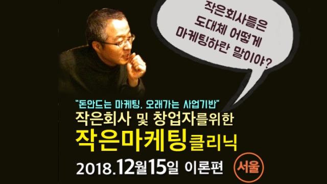 ◇ [12월 15일 토] 작은회사 및 창업자를 위한 작은 마케팅 클리닉 공개강의=작은 마케팅 클리닉이 작은 회사 및 창업자를 위한 공개 강의를 오는 15일 토요일 강남구 에임하이빌딩 5층 유알라운지에서 개최한다. 이번 강의는 창업자, 스타트업, 소기업, 중소기업, 1인기업, 자영업자, 소상공인, 예술인, 예비창업인 등 작은 기업이 지속가능한 사업 기반을 만들 수 있도록 안내하는 정기 공개 강좌다. 강의는 마케팅의 본질부터 전략, 실전도구까지 이론으로 배울 수 있는 내용으로 준비되어있다. 행사에 대한 자세한 내용은 이곳에서 확인할 수 있다.