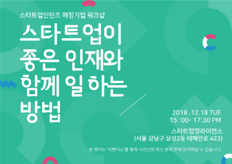 ◇ [12월 11일 화] 스타트업이 좋은 인재와 함께 일하는 방법=스타트업인턴즈 매칭기업 워크샵 ‘스타트업이 좋은 인재와 함께 일하는 방법’이 오는 18일 15시부터 강남구 스타트업얼라이언스에서 개최한다. 스타트업 인턴즈는 스타트업 세상이 궁금한 인재와 우수한 스타트업을 연결하는 인재(인턴/신입)매칭 프로그램이다. 이번 행사는 스타트업에서 중요한 ‘사람’을 위해 이야기하기 위함. 오이씨랩 장영화 대표의 오프닝을 시작으로 스타트업인턴즈 김나이 코치가 ‘밀레니얼세대와 함께 일하기’, 브라운백커피 손종수 대표가 ‘브라운백커피가 좋은 인재와 함께 일하는 방법’을 이야기할 예정이다. 행사에 대한 자세한 내용은 이곳에서 확인할 수 있다.