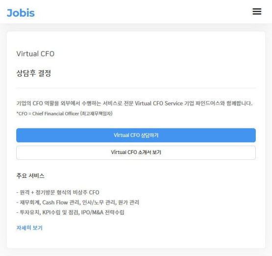 자비스를 이용하는 중소기업은 파인드어스와의 별도 계약을 통해 ▲현금흐름 관리 및 자금계획 수립, ▲주요 경영지표 관리, ▲세무/회계 자문, ▲내부관리 체계 구축, ▲사업계획 및 IR 자문 서비스를 CFO를 직접 채용하지 않고도 제공받을 수 있다.