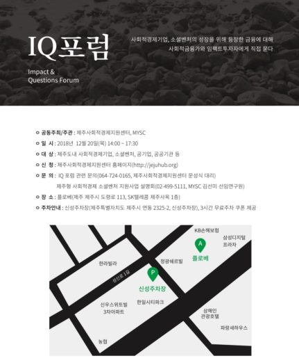 ◇ [12월 20일 목] IQ포럼: 제주에서 만나는 임팩트 금융=제주사회적경제지원센터와 MYSC가 제주도 내 사회적경제기업, 소셜벤처, 공기업, 공공기관 등을 위한 IQ(Impact & Questions) 포럼을 12월 20일 14시부터 SK텔레콤 제주사옥 1층 플로베에서 개최한다. 행사는 제주에서 만나는 임팩트 금융을 슬로건으로 사회적경제기업, 소셜벤처의 성장을 위해 등장한 금융에 대해 사회적금융가와 임팩트투자자에게 직접 듣는 자리가 될 예정. 임준우 전 sopoong 대표를 모더레이더로 삼아 사회적 금융세션과 임팩트 투자세션, 제주형 소셜 벤처 육성사업 설명회로 나눠 진행할 예정이다. 행사에 대한 자세한 내용은 이곳에서 확인할 수 있다.