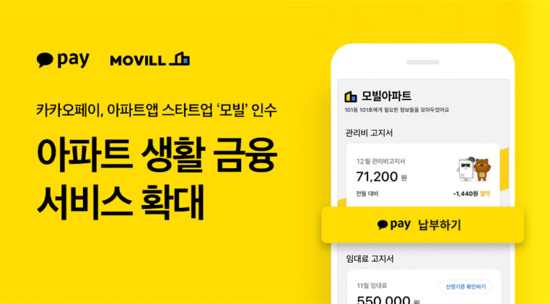 카카오페이와 모빌은 19일부터 본격적으로 카카오페이 플랫폼과 연계한 아파트 생활 금융 서비스 확대에 나선다. 아파트앱 모빌을 이용 중인 입주민은 카카오페이로 아파트관리비를 납부할 수 있으며 추가 과금 및 별도 앱 설치 없이 카카오톡을 통해 아파트관리비 청구서를 받아볼 수 있다. 납부는 모빌 앱에 접속하면 카카오페이로 가능하다..