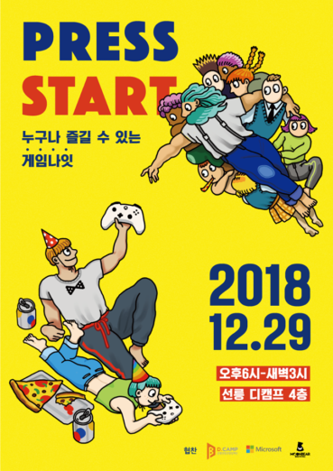 ◇ [12월 29일 토요일] PRESS START : 누구나 즐길 수 있는 게임나잇=스타트업 크리에이터 ‘ㅌㅇ’김태용과 실리콘밸리 게임 개발자 지민웅을 주축으로 총 6명의 기획팀이 모여 ‘인디게임파티 :PRESS START’를 12월 29일 토요일 디캠프 4층 커뮤니티 라운지에서 개최한다. 이번 행사는 디캠프, 한국마이크로소프트, 문베어 브루잉 등 함께한다. 행사 프로그램은 오버쿡드!2, 완드워즈, 얼티밋 치킨 홀스, 로켓리그, N++ 등 파티게임을 자유롭게 플레이 하는 자유 플레이 게임과 당일 현장에서 선착순 모집하는 엉망진찬 토너먼트, DJ펀킨캣과 함께하는 게임음악 디제잉 파티로 구성되어 있다. 행사에 대한 자세한 내용은 이곳에서 확인할 수 있다.