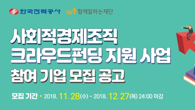 ◇ [12월 27일 목요일] 사회적경제조직 크라우드펀딩 지원사업=한국전력공사와 (재)함께일하는재단이 사회적경제조직 크라우드펀딩 지원 사업팀을 12월 27일까지 모집한다. 이번 지원 사업은 사회적경제조직의 사업홍보 및 운영 자금 마련을 돕고 사회적 문제에 대한 관심이 사회적 가치를 이끌어 낼 수 있게 하기 위한 것.