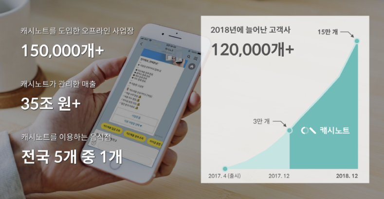 캐시노트는 2017년 첫해 고객사 3만 개를 확보했고 재방문 고객 관리와 세금계산서 매입 관리, 리뷰 관리 등 기능을 늘리면서 1년 8개월 만에 15만 개 사업장을 확보했다. 12월 한 달 유입 고객사만 2만 개다.