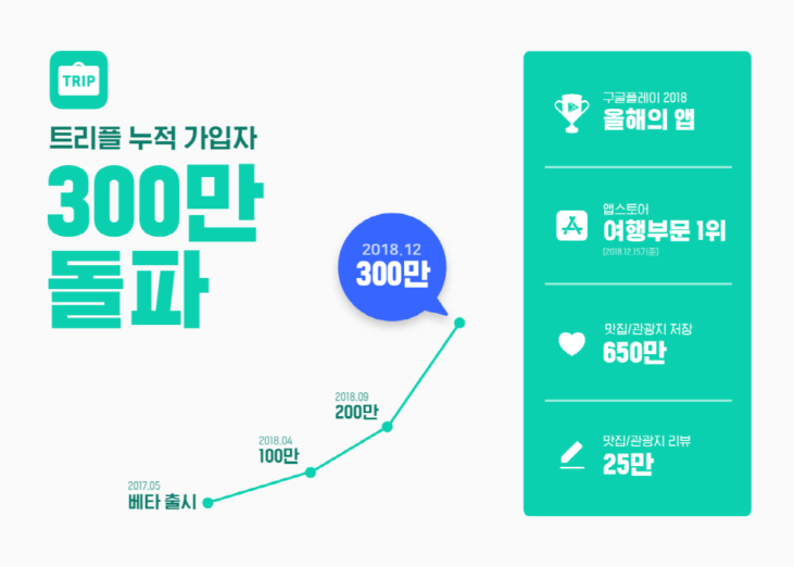 트리플이 누적 가입자 300만 명을 넘어섰다고 밝혔다. 지난 9월 200만 명 돌파 이후 3개월 만에 다시 100만 명을 추가한 것. 회사 측에 따르면 트리플 내에 저장된 가고 싶은 장소는 650만 건, 리뷰 수는 25만 건이다.