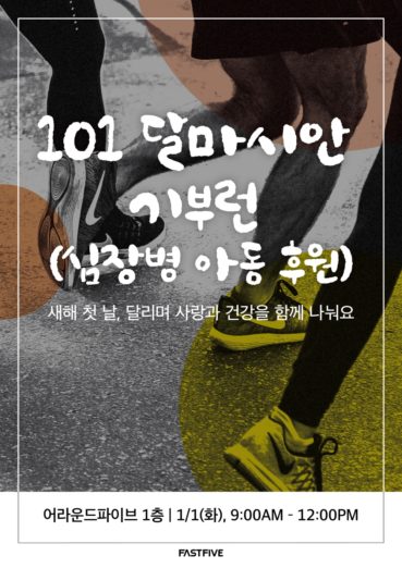 ◇ [1월 1일 화] 심장병 아동 수술비 지원을 위한 101 달마시안 기부런=국내 공유오피스 업체 패스트파이브와 사단법인 굿피플 인터내셔널에서 새해 첫날인 1일에 기부 러닝 행사를 성수에 위치한 패스트파이브가 기획 및 운영하는 카페 어라운드 파이브에서 개최한다. 행사는 러닝 인플루언서 김성우와 요가 인플루언서 황지혜가 함께한다. 러닝 행사는 인플루언서 러너의 주도 하에 3km 혹은 5km 서울숲 힐링 러닝 코스를 완주할 예정. 또 러닝 대신 요가 클래스를 선택할 수 있다. 행사 참가비 일부는 심장병 아동의 수술비 지원을 위해 기부된다. 행사는 패스트파이브 멤버와 게스트 모두 참여가 가능하며 101명 규모로 진행된다. 행사에 대한 자세한 내용은 이곳에서 확인할 수 있다.